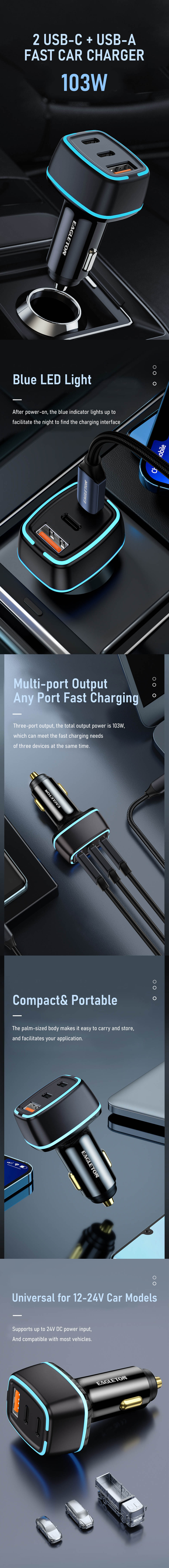 103W Car Charger 3-Port Charging Multi-Port Car Fast Charger Safety Protection LED Light