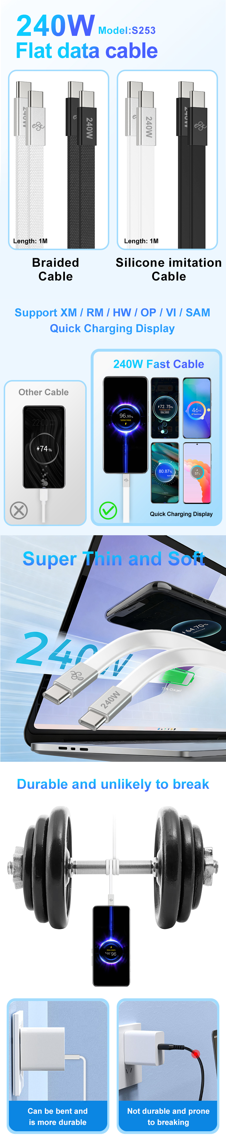 240W, 6A Silicone Copy/Braided Flat Cable, 1.2M,